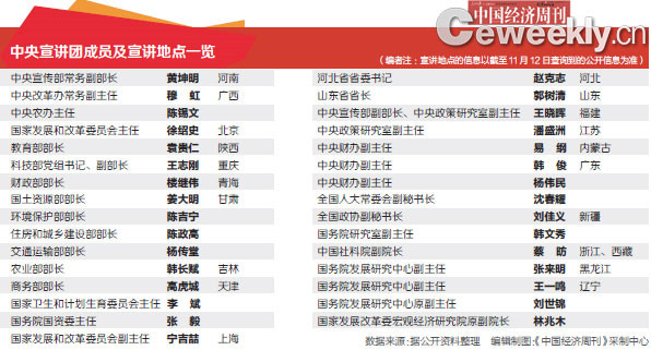 從宣講團的成員構成看,超過三分之一的宣講員為國務院部委的“一二把手”,來自的部委包括國家發改委、教育部、科技部、財政部、國土資源部、環保部、住建部、交通運輸部、農業部、商務部、衛計委、國資委等;還有來自中宣部、中央政研室、中央財辦、全國人大、全國政協的相關負責人以及最高智囊機構中國社科院、國務院發展研究中心的學者。
