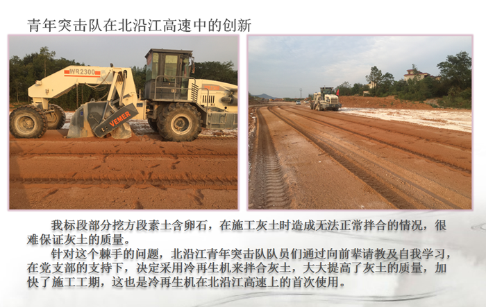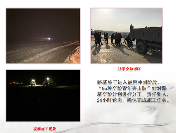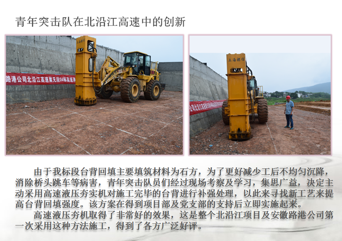在工程建設(shè)中,該青年突擊隊圍繞“急、難、新、險、重”的任務(wù)開展了一系列活動。一是成立“96頂交驗青年突擊隊”,針對路基交驗計劃進行分工,責任到人,24小時輪崗,加快了施工進度;二是立足崗位,創(chuàng)新創(chuàng)效,采用高速液壓夯實機的創(chuàng)新工藝對臺背回填質(zhì)量進行補強,采用冷再生機拌合灰土提高灰土質(zhì)量,加快施工工期;三是規(guī)范要求,精細交底保安全,組織開展各類質(zhì)量安全文明進班組和質(zhì)量安全自查自糾活動,對施工人員進行了現(xiàn)場工序施工可視化技術(shù)交底,切實提高職工質(zhì)量安全意識,青年職工的智慧在青年文明號創(chuàng)建過程中得以彰顯和應(yīng)用。