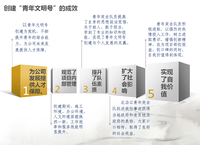 爭創(chuàng)活動中,主要圍繞8個方面開展工作。一是建立以突擊隊隊長為負責人的創(chuàng)建領(lǐng)導小組,定期組織上團課,加強隊員思想教育;二是開展“我為重點工程獻青春”為主題的勞動競賽活動,激發(fā)團員青年的拼搏奉獻精神;三是建立健全創(chuàng)建檔案,做好資料留存;四是以服務(wù)青年為中心,以提高工作質(zhì)量和效率為重點,創(chuàng)新工作模式;五是做好“師帶徒”,抓好“傳、幫、帶”, 設(shè)定青年人才培養(yǎng)目標,促進青年崗位成才;六是成立青年志愿者服務(wù)隊,開展志愿幫扶;七是建立青年安全監(jiān)督崗,助力安全生產(chǎn);八是結(jié)合項目實際,組織開展文體活動。