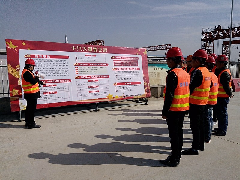 項目黨支部專門制定了學習十九大精神的學習計劃,將《黨章》、《十九大報告單行本》、《十九大報告輔導讀本》等發放到黨員干部手中。在項目部駐地醒目位置專門設立了十九大精神宣傳展板,在宣傳欄張貼了十九大相關學習資料,多措并舉營造學習氛圍,推進學習工作,學習好、宣傳好、貫徹好黨的十九大。
