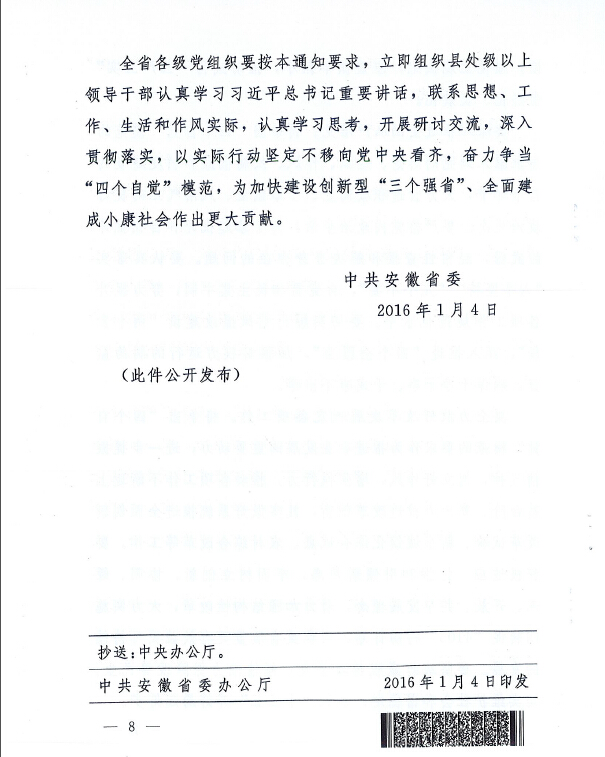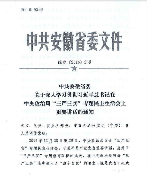 中共安徽省委關于深入學習貫徹習近平總書記在中央政治局“三嚴三實”專題民主生活會上重要講話的通知