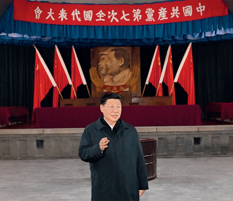 2022年10月27日,中共中央總書記、國家主席、中央軍委主席習近平帶領中共中央政治局常委李強、趙樂際、王滬寧、蔡奇、丁薛祥、李希,瞻仰延安革命紀念地。這是習近平在楊家嶺瞻仰中共七大會址。 新華社記者 燕雁/攝