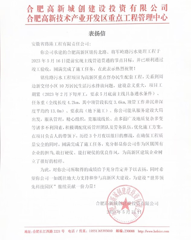 近日,高新區(qū)銘傳北路、將軍嶺路污水處理工程項目順利通過竣工驗收,并收到來自建設(shè)單位(合肥高新城創(chuàng)建設(shè)投資有限公司)書面表揚信。
