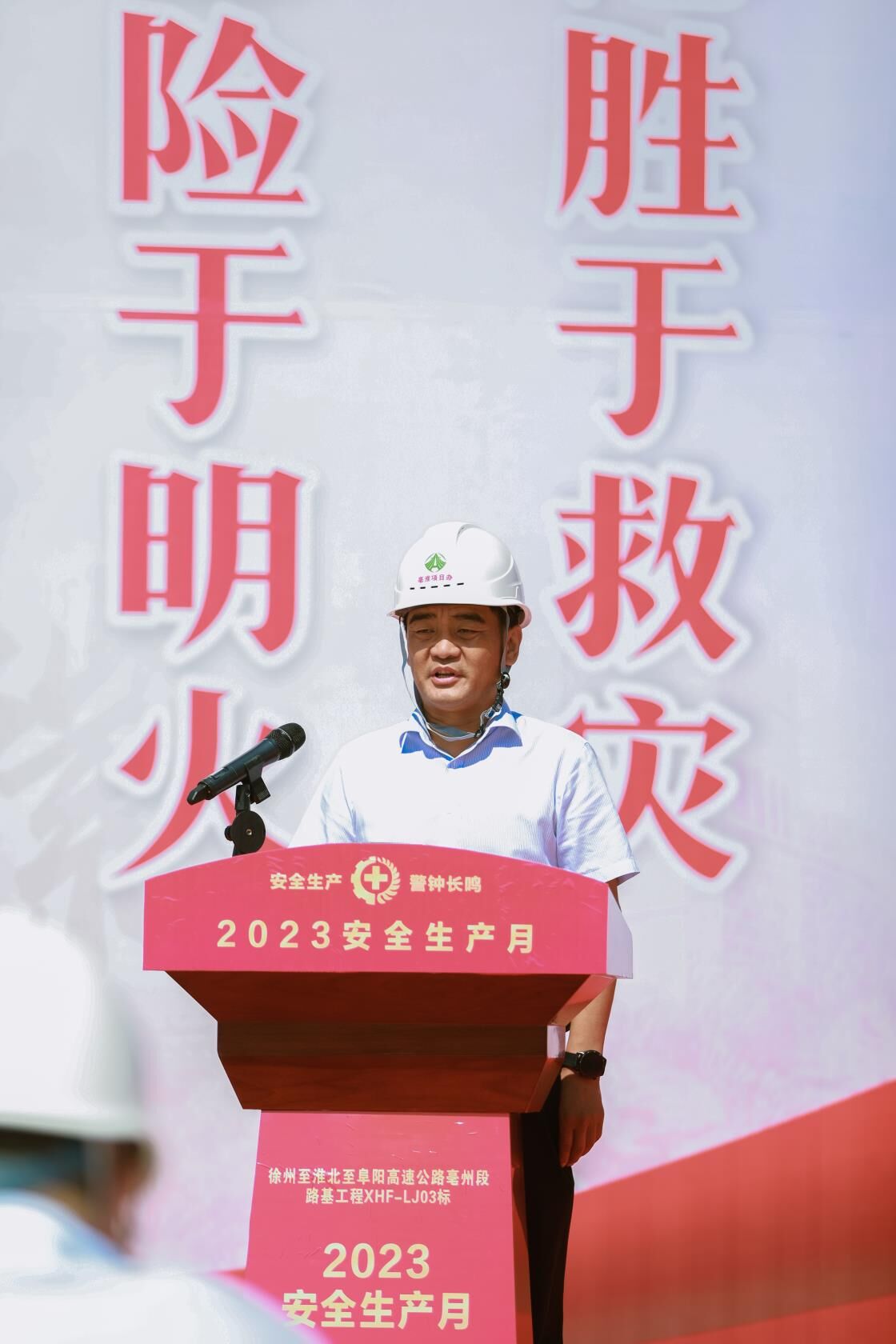 為認真貫徹項目公司安全生產要求,大力推進項目各項安全生產工作,增強全體職工的安全意識,徐淮阜亳州段路基03標項目部根據活動方案部署,圍繞今年“人人講安全,個個會應急”的安全月主題,6月6日上午9:30于渦河特大橋施工現場成功舉行2023年“安全生產月”啟動儀式。亳淮項目辦主任邵虎、渦陽縣高速公路建設指揮部主任于峰、縣交通運輸局副局長龐鑫、路橋分公司經理陳瑞以及本項目各參建單位代表出席本次活動。