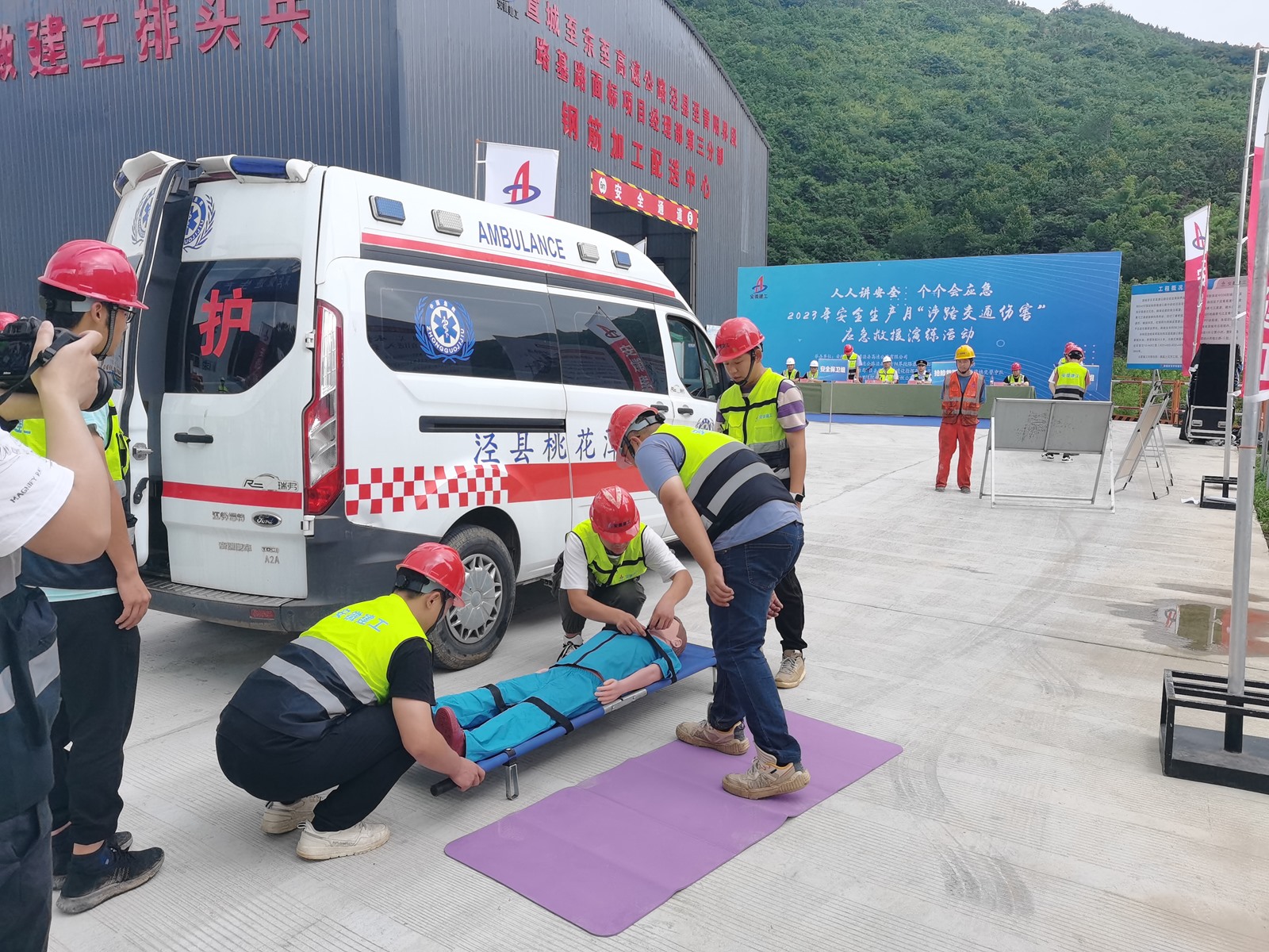 6月19日下午,涇青高速三分部項目圍繞“人人講安全、個個會應急”安全生產月活動主題開展交通事故應急救援演練。安徽建工集團涇縣高速公路有限公司、涇縣交運局執法大隊、桃花潭鎮交警中隊、桃花潭鎮中心衛生院、中心試驗室、總監辦等代表參加演練。