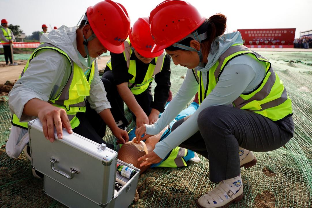 會后,章征組織項目參建各方前往施工現場觀摩項目質量、安全環保工作開展情況,隨后參加了“高處墜落”應急救援演練。
