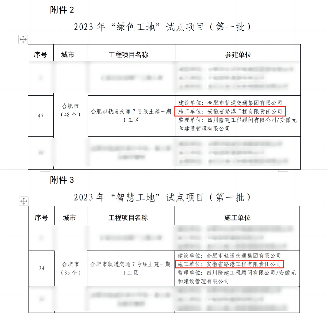 建工路港合肥市軌道交通7號(hào)線(xiàn)項(xiàng)目榮獲 安徽省“綠色工地”、“智慧工地”試點(diǎn)項(xiàng)目稱(chēng)號(hào)