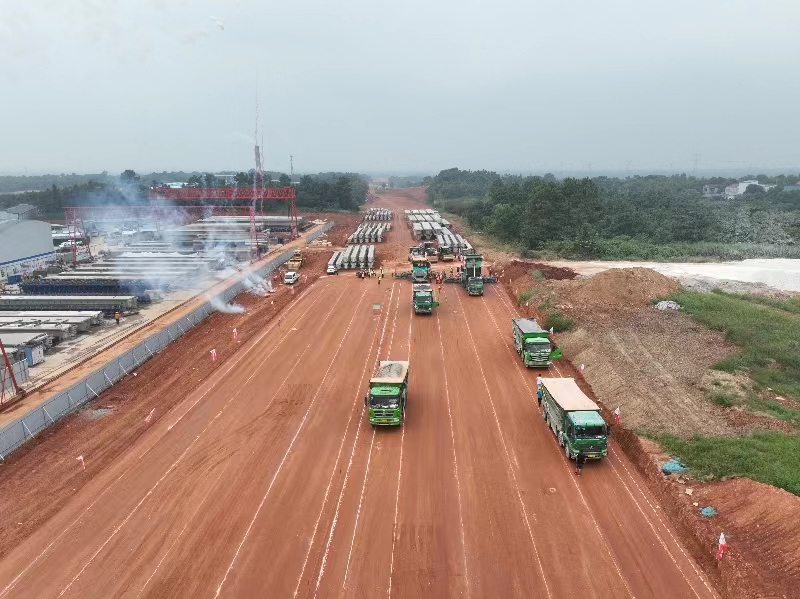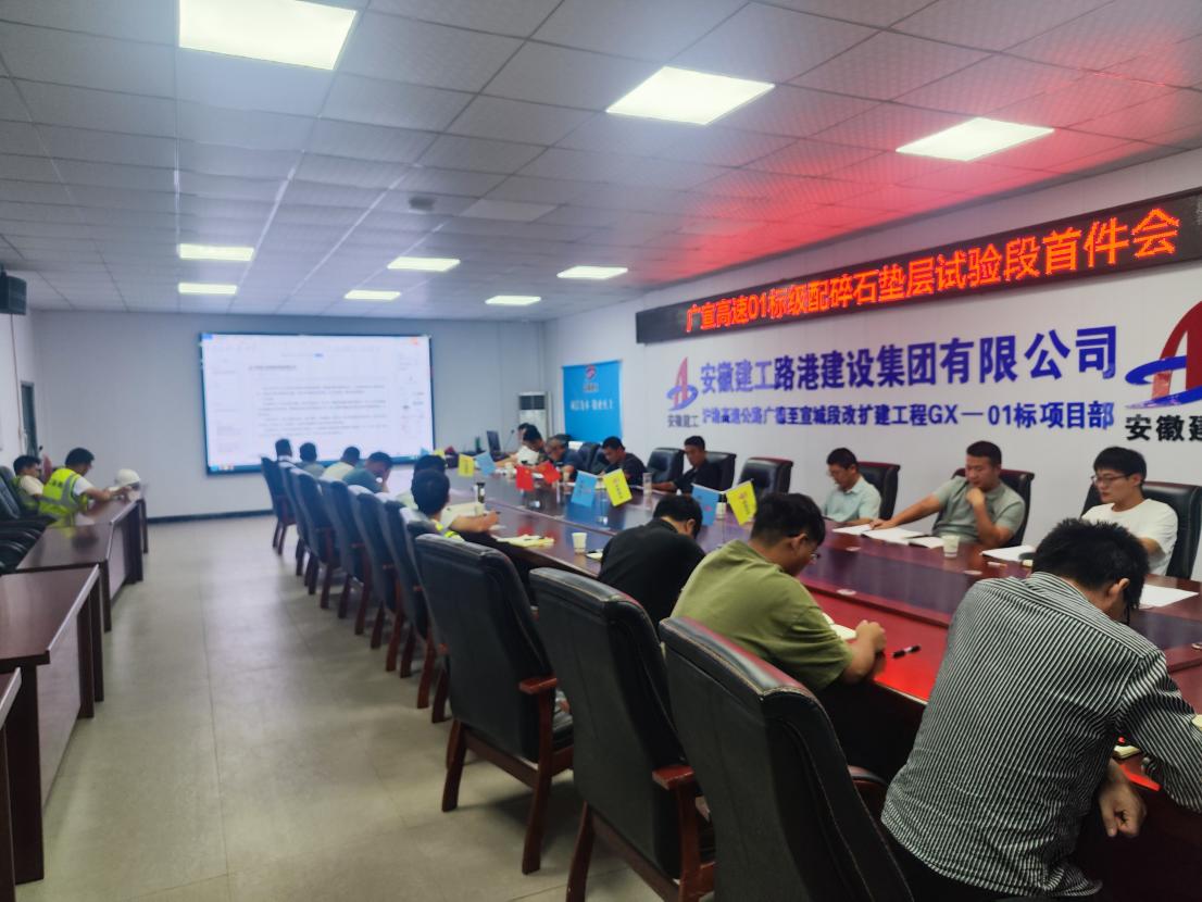 本次鋪筑的水穩底基層試驗段為K206+800-K207+000半幅,長200m。項目施工現場,攤鋪機、壓路機、卸料車忙碌而有序的展開鋪設作業。施工前,項目部聯合廣宣改擴建總監辦、駐地辦、第三方檢測單位提前籌劃,召開級配碎石墊層試驗段首件會,嚴格審核施工方案。