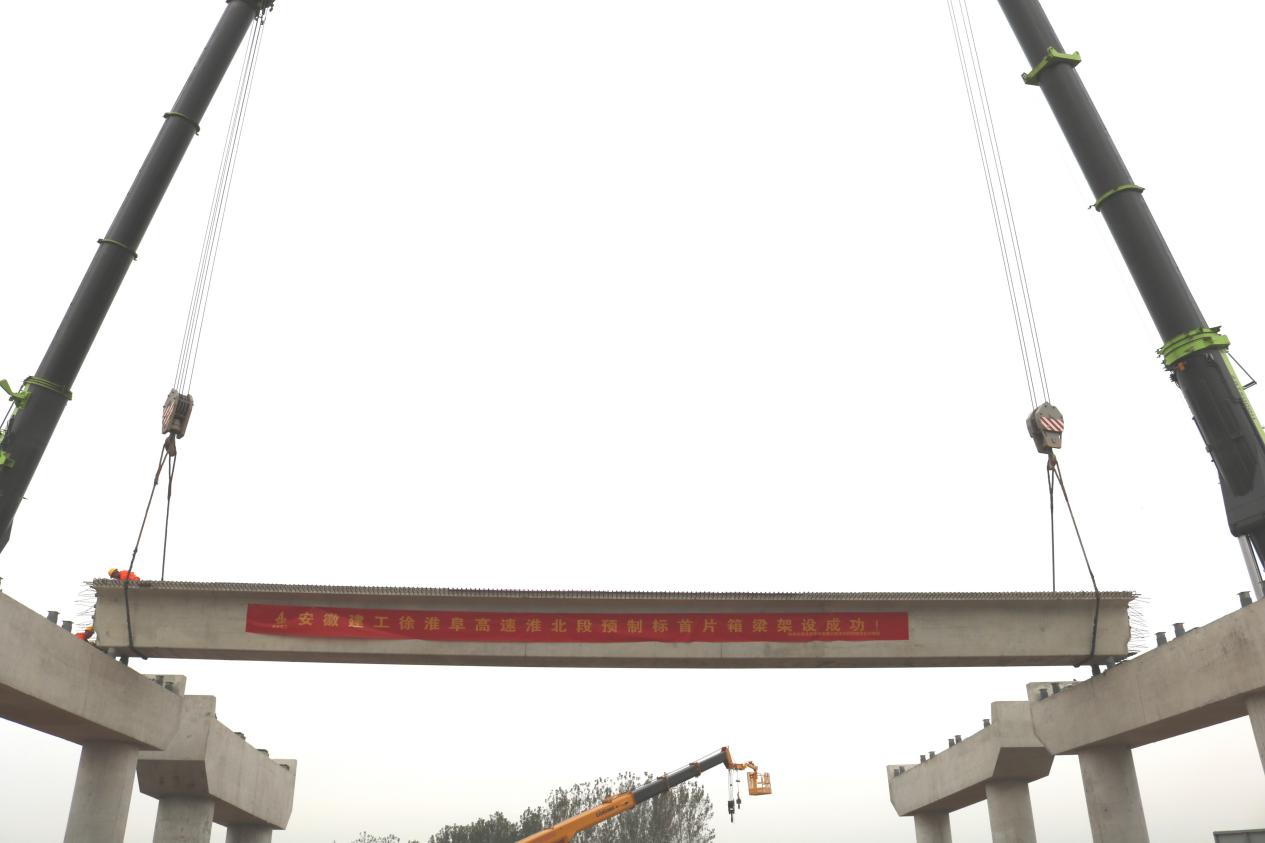 10月10日上午九點,隨著首榀25米重達約80t的箱梁穩穩落下,徐淮阜高速淮北段預制標項目首榀箱梁順利架設完成。