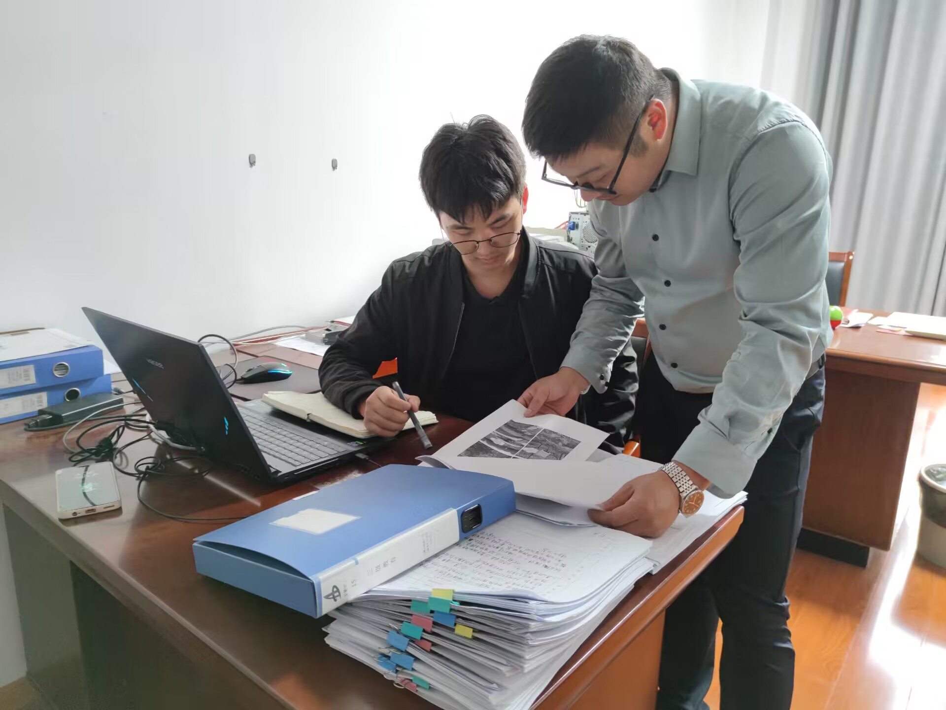 我的師傅莫聲章,他認真負責、經驗豐富,每次去工地總會教我各種專業知識、施工儀器的使用方法以及施工所要注意的各項規章制度,確保我們不會犯錯。他認真耐心,每每歇息的時候還會為我講解施工圖紙中我所不能理解的地方,教我為人處世的方法,使我能更好地與業主和監理等領導進行對接。非常感謝師傅對我的教誨,讓我更好地成長。