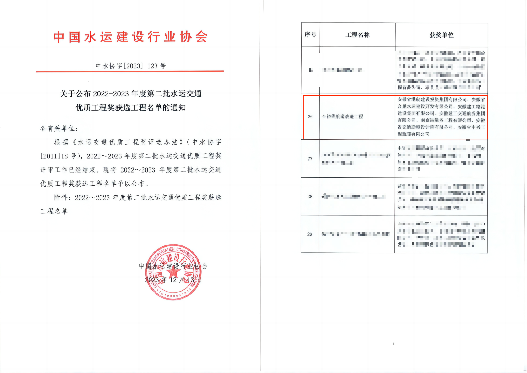 近日,從中國水運建設行業(yè)協(xié)會傳來喜訊,公司承建的合裕線航道改造工程獲全國水運建設行業(yè)工程質(zhì)量評選最高獎項——中國水運交通優(yōu)質(zhì)工程獎。