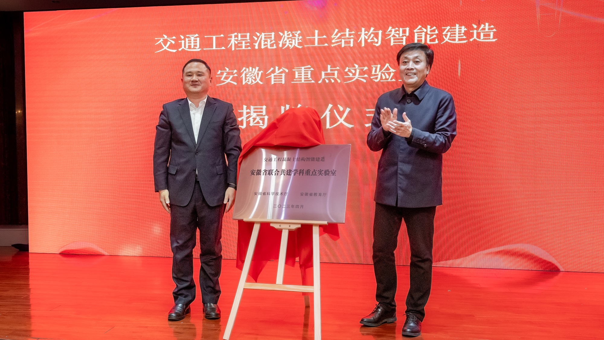 魏軍鋒和公司董事長錢葉琳共同為交通工程混凝土結構智能建造安徽省聯合共建學科重點實驗室揭牌,為船閘智能建造開辟新的研究平臺。