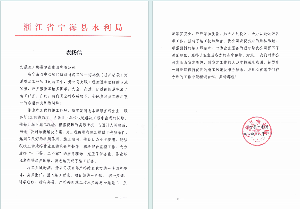 12月28日,寧海縣中心城區防洪排澇工程-梅林溪(橋頭胡段)河道整治工程項目部收到業主浙江省寧海縣水利局的表揚信,對公司克服工程建設中面臨的場地緊張、任務繁重等諸多困難,安全、高效、優質的圓滿完成了施工任務給予肯定及感謝!