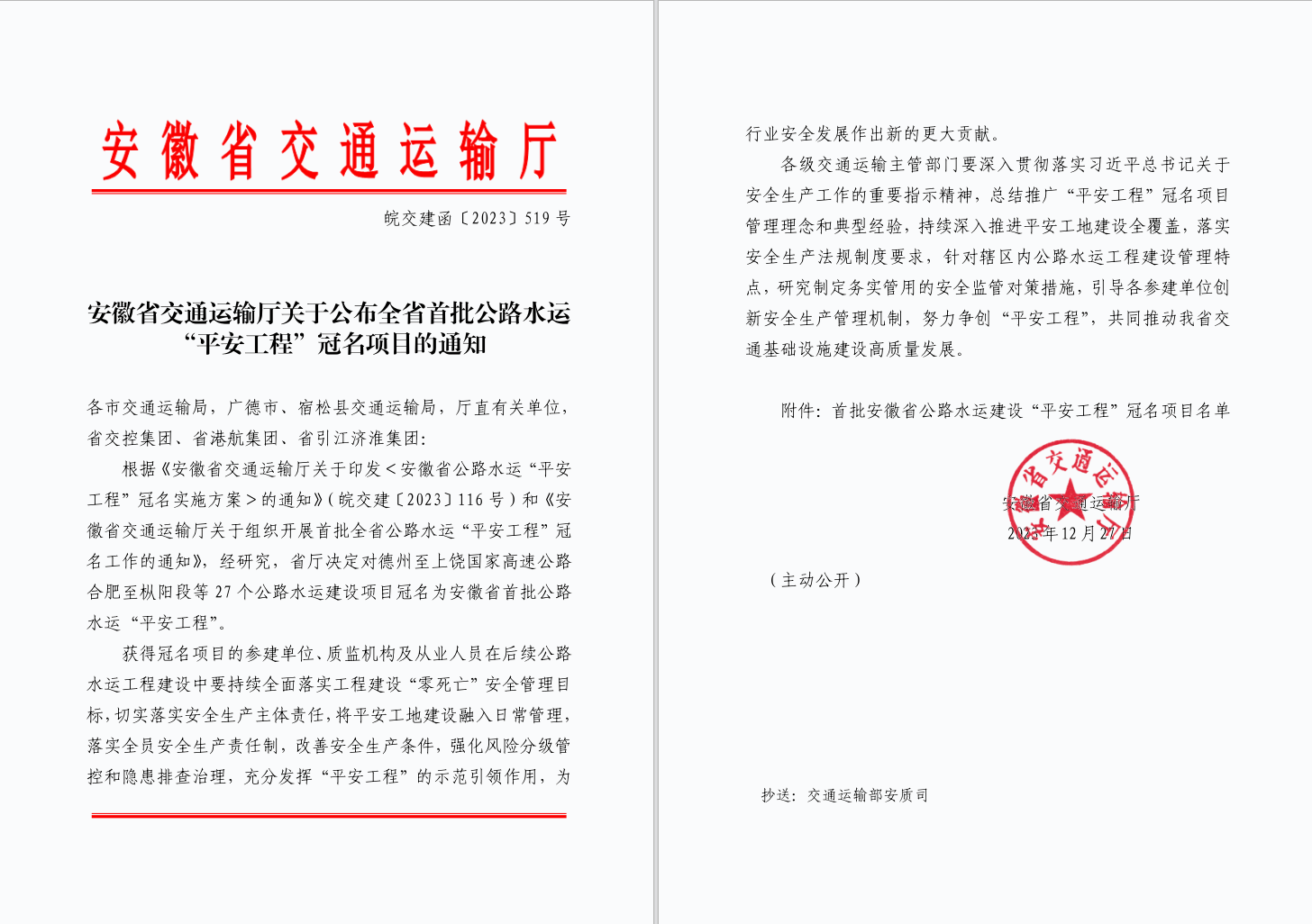 近日,安徽省交通廳公示了安徽省首批公路水運“平安工程”冠名項目名單,我單位承建的G5011蕪合高速公路蕪湖至林頭段改擴建工程01標、北沿江高速公路滁州至天長段路基02標及預制標、明光至巢湖高速公路合肥段、亞洲開發銀行貸款安徽綜合交通基礎設施項目水陽江航道整治工程疏浚標段和S244羅崗至分路口段公路工程01標等6個項目榮獲安徽省首批公路水運“平安工程”冠名。
