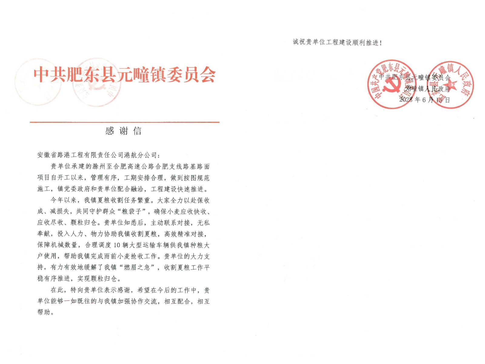 近日,滁河支線項(xiàng)目部收到中國(guó)共產(chǎn)黨肥東縣元疃鎮(zhèn)委員會(huì)、肥東縣元疃鎮(zhèn)人民政府感謝信,對(duì)項(xiàng)目部在當(dāng)?shù)叵募Z收割過(guò)程中所給予的幫助表示感謝。