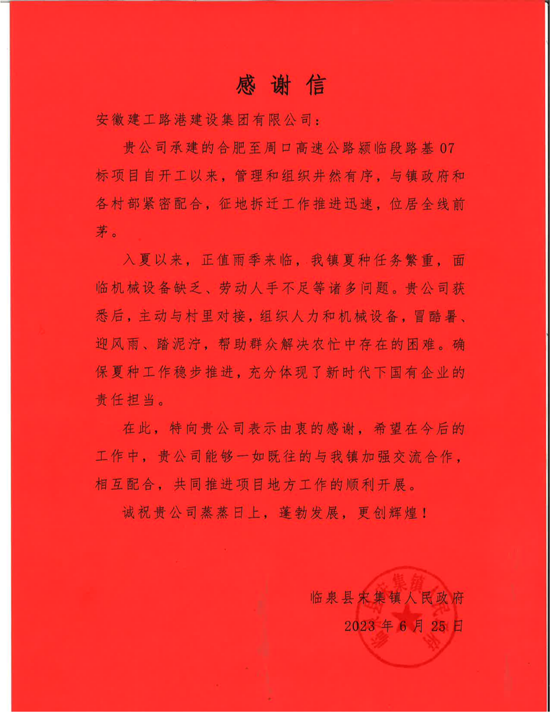 6月25日,路橋分公司合周高速潁臨段路基07標項目收到項目所在地臨泉縣宋集鎮(zhèn)人民政府感謝信,對項目部與地方政府緊密配合和給予的幫助表示感謝。
