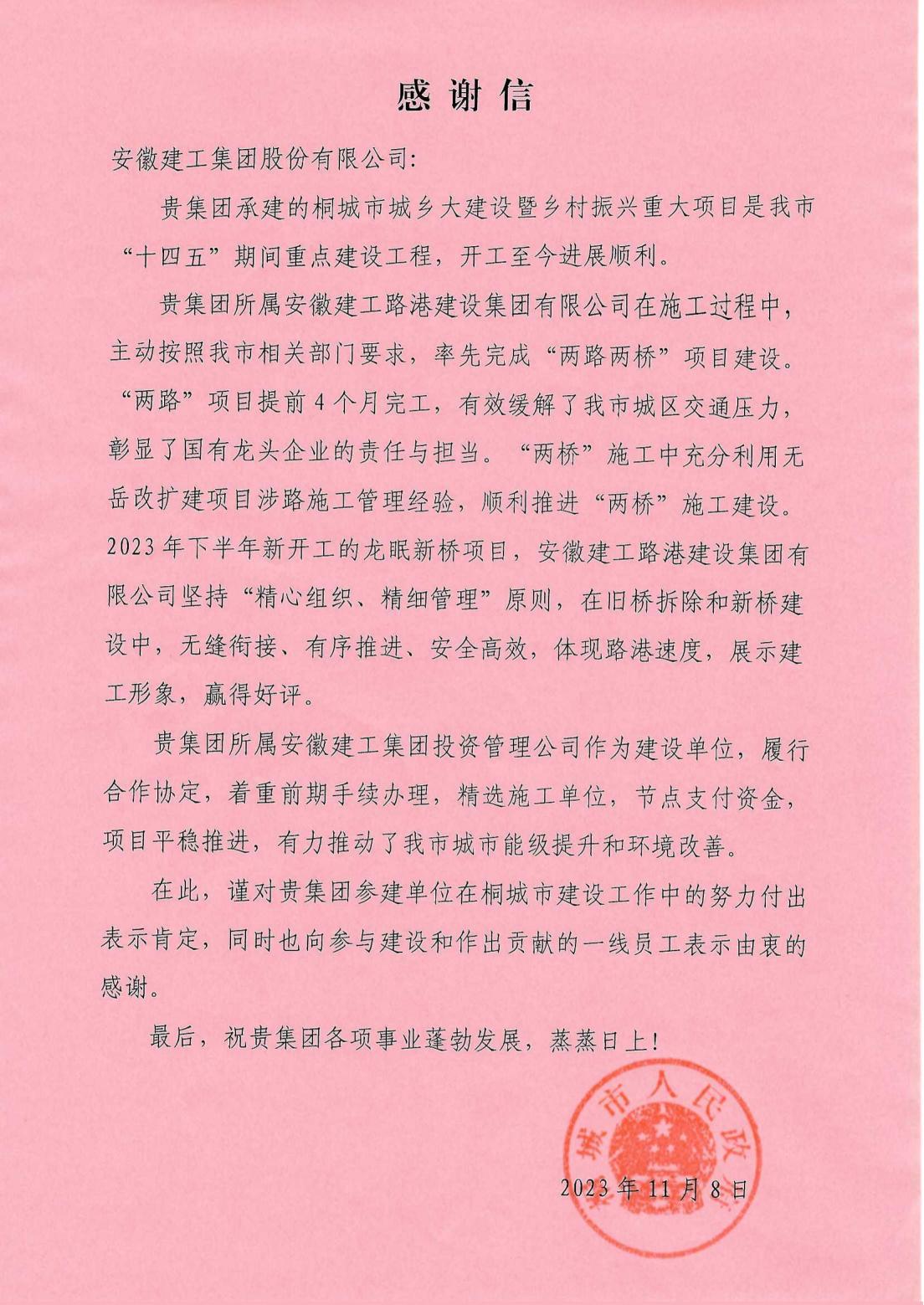 日前,桐城市人民政府給公司送來感謝信,對建工路港在桐城市建設(shè)工作中的努力付出表示肯定,向參與建設(shè)和作出貢獻(xiàn)的一線員工表示由衷的感謝。