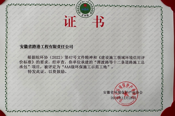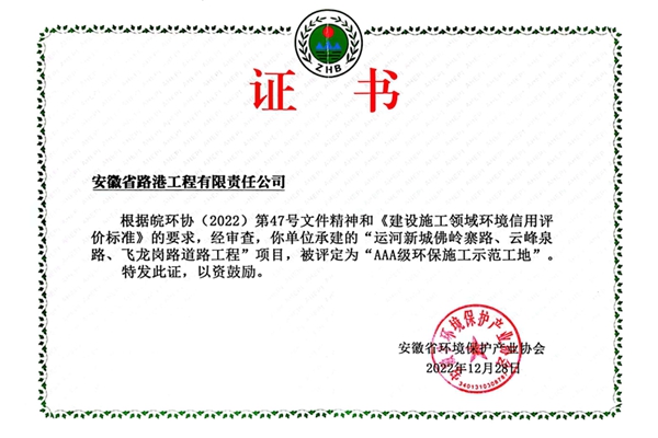 近日,市政分公司運河新城項目、潭渡路項目獲評安徽省環境保護產業協會“省AAA級環保施工示范工地”稱號。