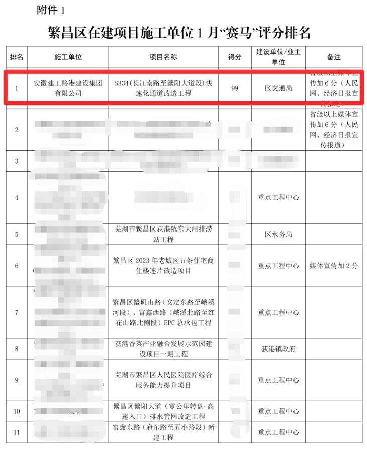 2月7日,蕪湖市繁昌區人民城市建設委員會發布《關于2024年1月在建項目施工單位“賽馬”結果的通報》,由建工路港承建的s334項目以最高分99分奪得最高獎項“天馬獎”,這也是業主自10月開展“賽馬”評比活動以來,連續4次蟬聯該獎項。