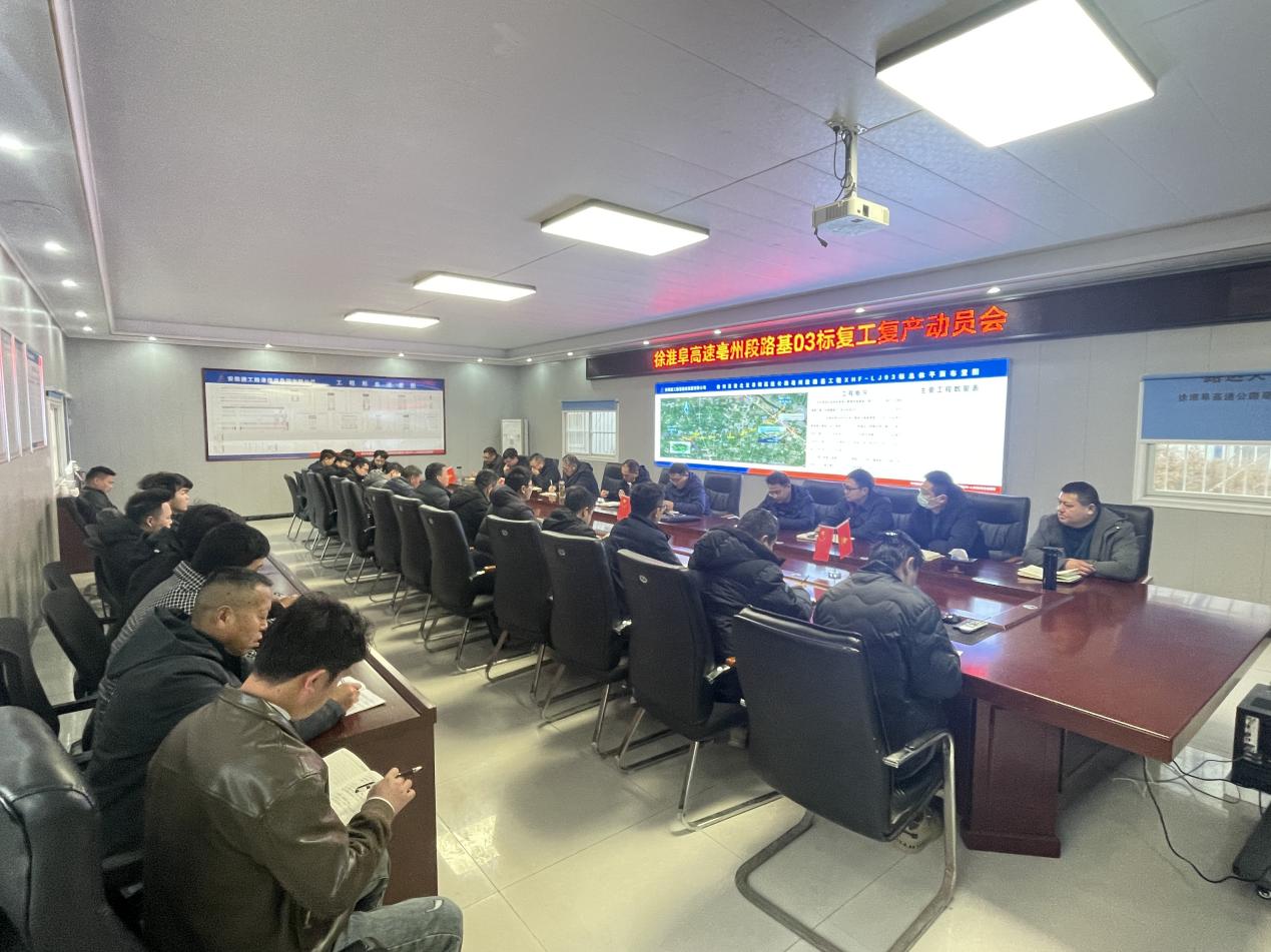 徐淮阜亳州段路基03標項目于2月19日上午組織召開復工復產動員會,助力全體干部職工從春節(jié)長假中迅速調整工作狀態(tài),重整行裝再出發(fā),全力以赴謀劃新一年工作,為2024年的各項工作開好局、起好步。