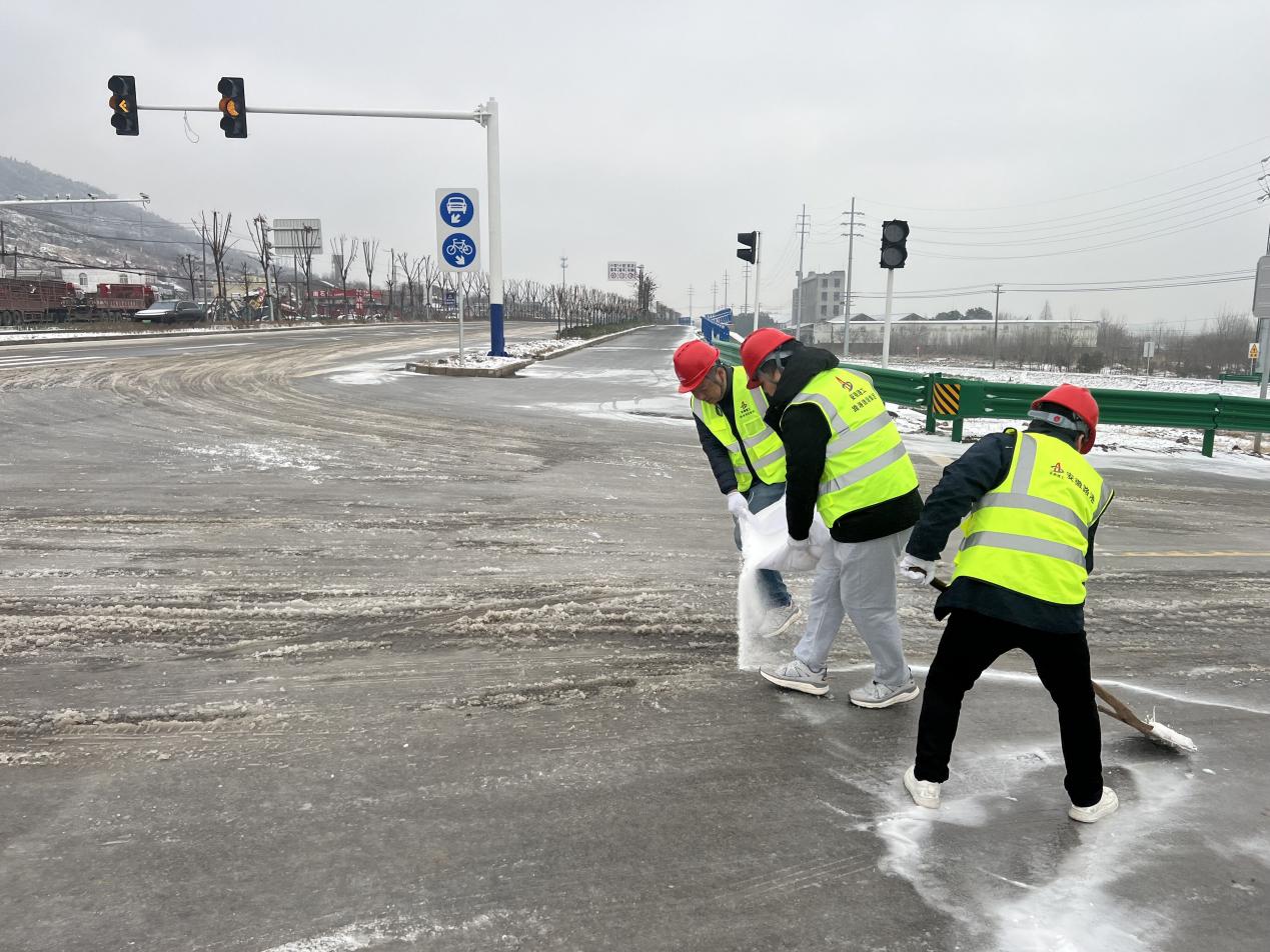 G206-04標(biāo)所建公路段道路結(jié)冰,項(xiàng)目人員全體出動(dòng)開展撒融雪劑,除冰工作,保障來往車輛行人安全。