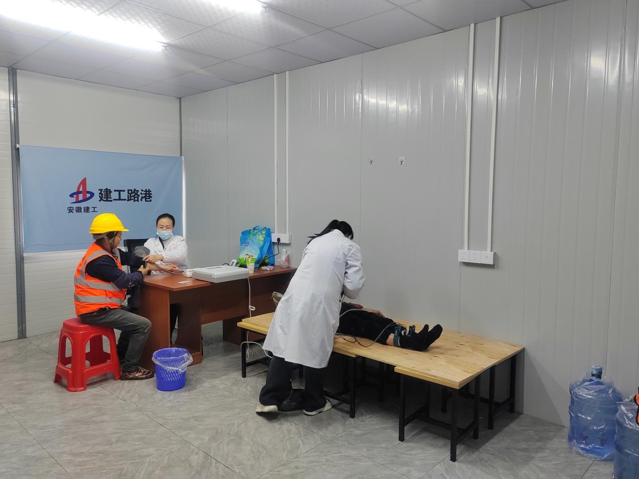 項目部特邀醫務人員上門,重點檢查高血壓、心電圖等多項內容,同時分批次通知各勞務班組,確保工人體檢、安全施工兩不誤。醫務人員耐心解答工友們咨詢的問題,并向他們普及疾病預防的相關知識。