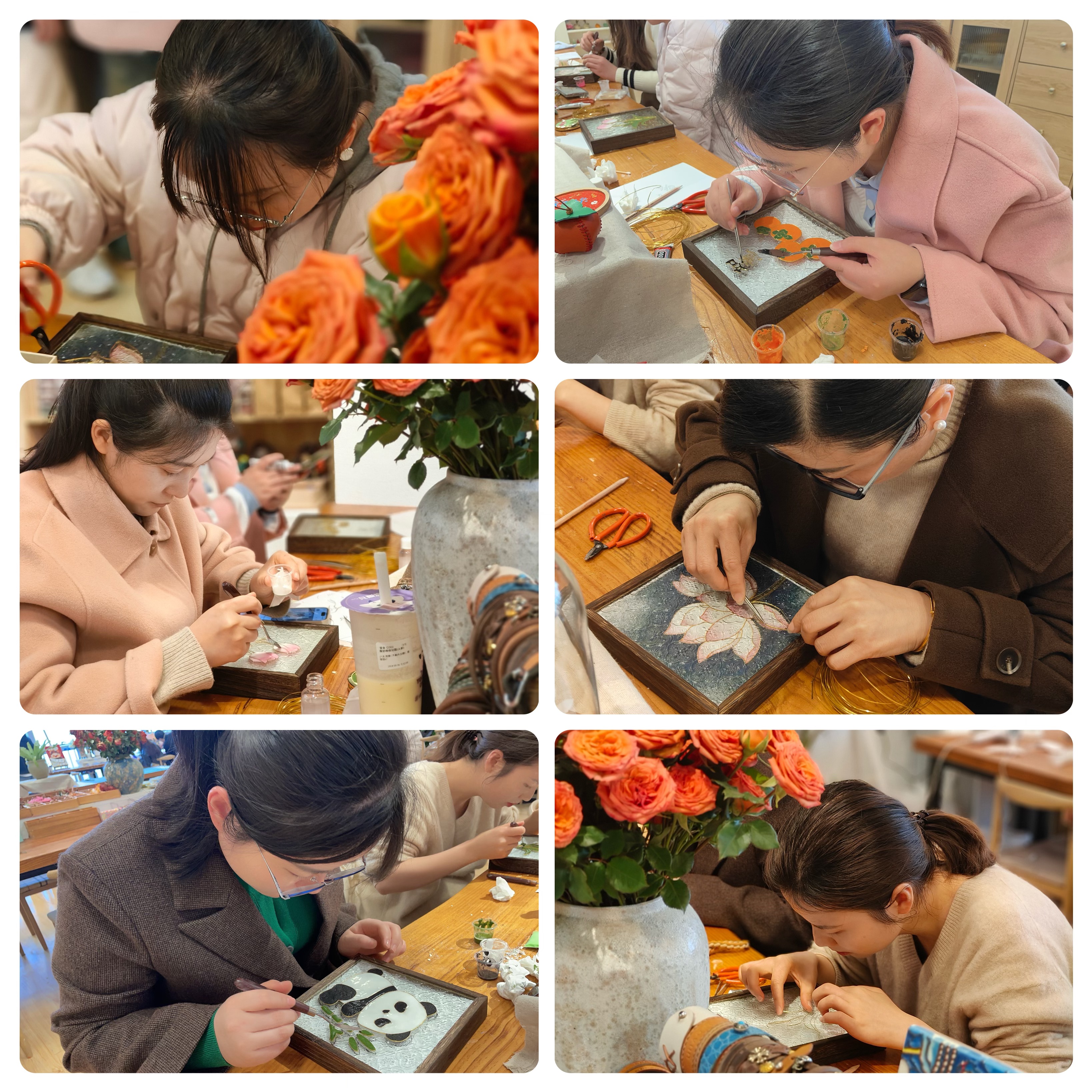 跟隨指導老師的腳步,感受藝術的氣息,女職工從中體會到非遺文化的魅力所在,迫不及待地想要動手體驗這歷經百余年的掐絲琺瑯工藝。手指揮動,勾勒出精美輪廓;彩砂揮灑,填充出亮眼色彩。在老師的指導下,一個個充滿創意的作品紛紛呈現,無不彰顯著他們那天馬行空的想象力。