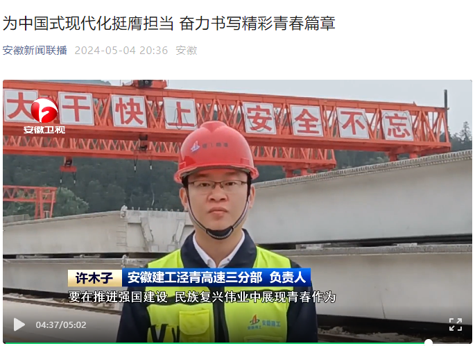 內容簡介:安徽新聞聯播在《為中國式現代化挺膺擔當 奮力書寫精彩青春篇章》的專題中采訪了建工路港涇青高速三分部負責人許木子,聆聽廣大新時代好青年的心聲。