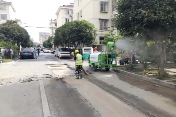 三是配備多名專職保潔人員,保證垃圾及時清理、場地及時清洗;多臺霧炮設備循環工作,保持作業過程濕潤無浮塵;物料集中擺放整齊,裸露土堆覆蓋濾網,保持現場布局有序、和諧美觀。