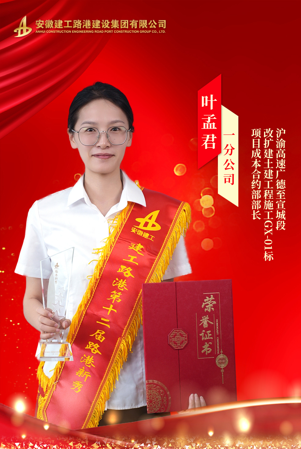在工作中,她以事不避難的擔當精神,做細做實項目合同全周期工作,榮獲了宣城市“十佳勞資專員”和公司 “先進工作者”等榮譽稱號。