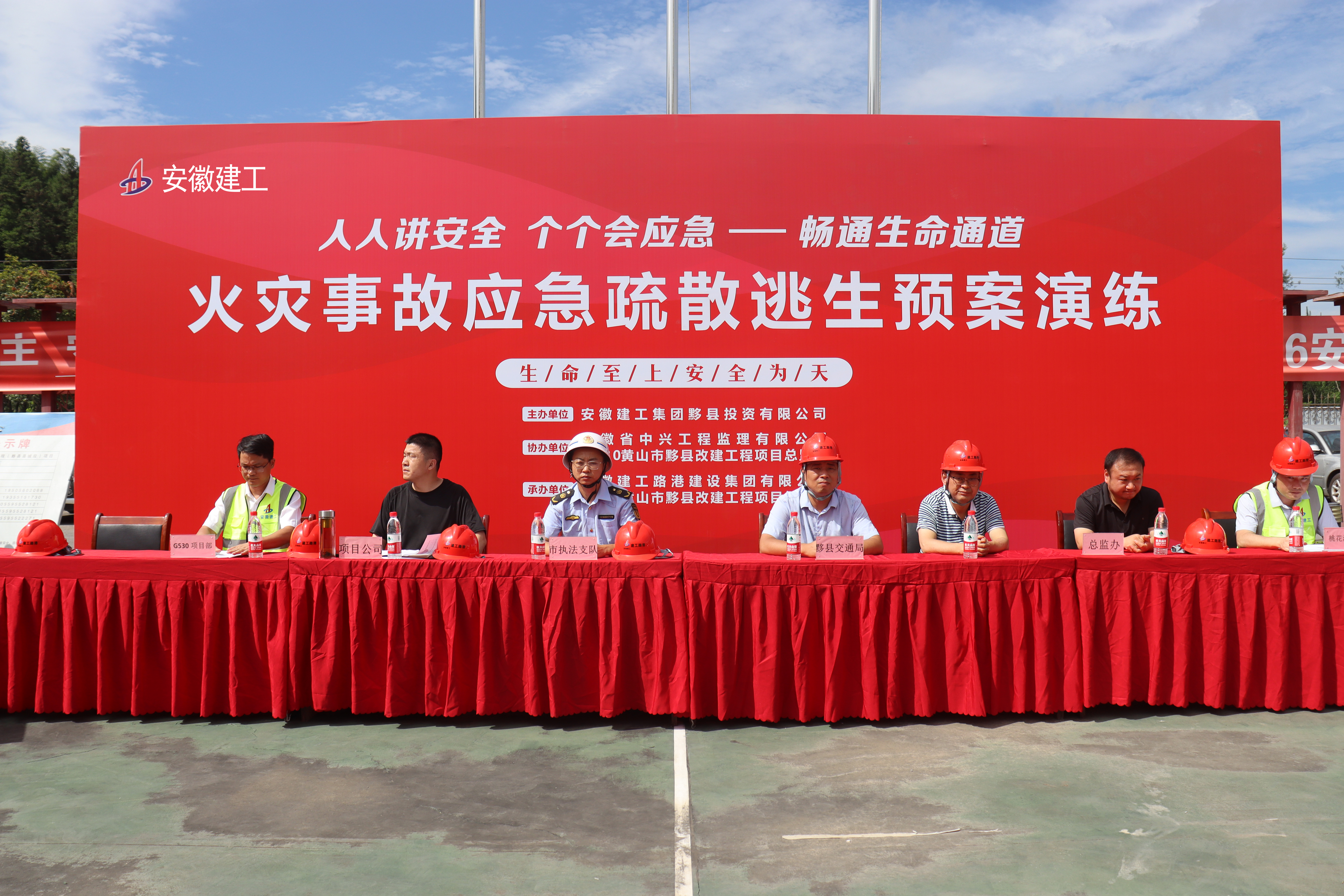 7月19日上午,黟縣G530項目組織開展火災事故應急疏散演練。黃山市執法支隊主管李濤、黟縣交通局副局長傅義民、安徽建工集團黟縣投資公司副總經理陶永俊等相關單位領導應邀參加此次演練。