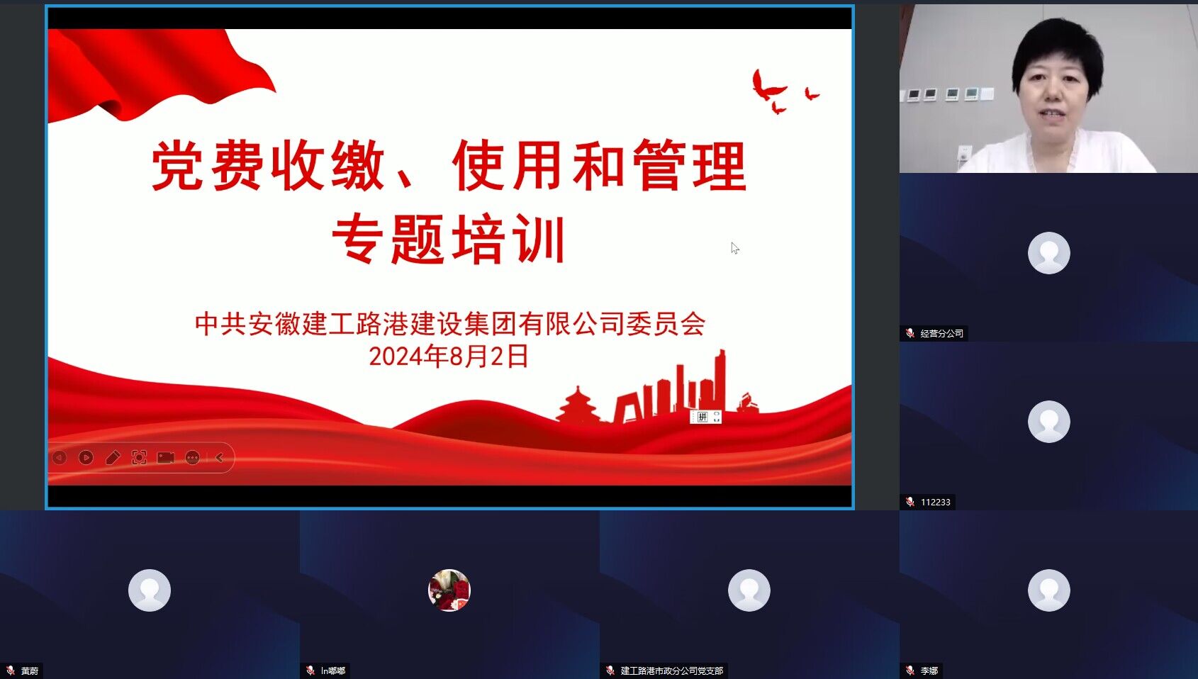 為進一步加強黨費收繳、使用和管理工作,提高黨務工作者的業務水平和責任意識,8月2日,建工路港組織開展了黨費收繳、使用和管理視頻培訓,所屬各黨支部(總支)黨務工作人員線上參加培訓,公司黨委秘書、機關一支部書記王雨授課。