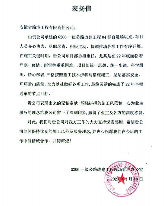 G206荊涂大橋至蚌埠宿州交界段一級(jí)公路改建工程04標(biāo)順利通過(guò)交工驗(yàn)收為項(xiàng)目全周期建設(shè)工作交出了一份滿(mǎn)意的答卷。下一步,項(xiàng)目部全體管理人員將強(qiáng)化責(zé)任擔(dān)當(dāng),高效率、高質(zhì)量做好項(xiàng)目決算、下游結(jié)算、竣工資料移交等相關(guān)工作。(文/李維恬)