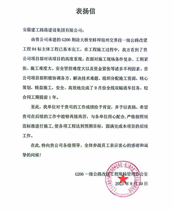 近日,G206荊涂大橋至蚌埠宿州交界段一級(jí)公路改建工程04標(biāo)項(xiàng)目順利通過(guò)交工驗(yàn)收。