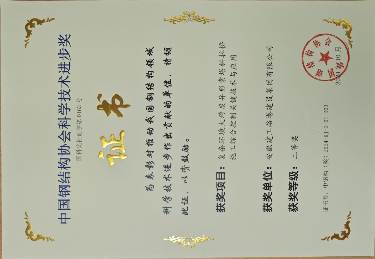 近日,“中國鋼結構協會成立40周年大會暨2024中國鋼結構大會”在北京召開,建工路港“復雜環境大跨度異形索塔斜拉橋施工綜合控制關鍵技術與應用”項目榮獲中國鋼結構協會科學技術獎二等獎。