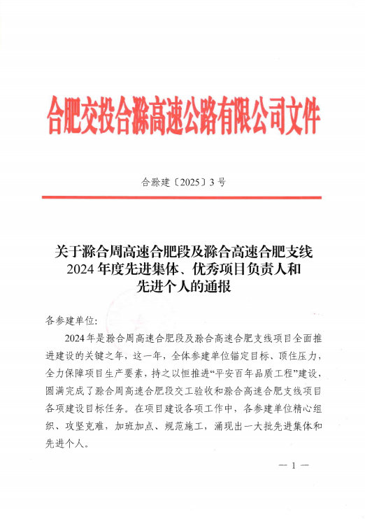 近日,合肥交投合滁高速公路舉辦2024年度總結大會暨表彰大會。滁合支線項目榮獲2024年度“先進集體”稱號,徐海東同志榮獲“優秀項目負責人”稱號,張興強、王盛楠、耿貝貝同志榮獲先進個人稱號。