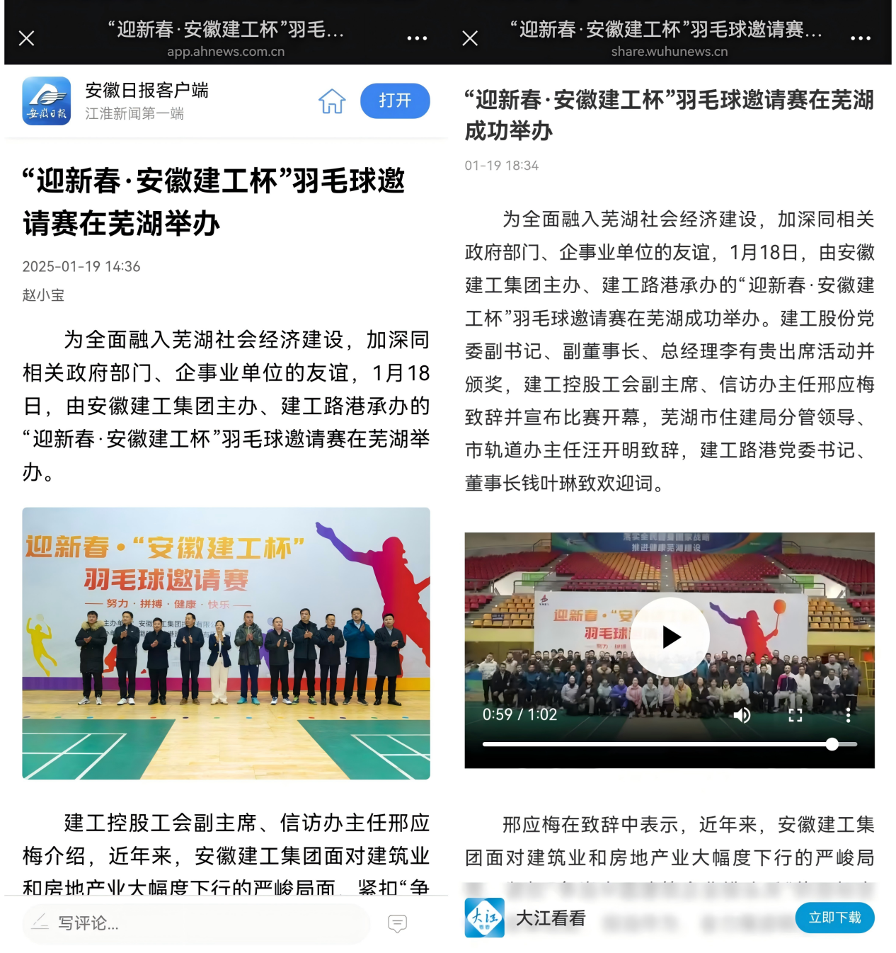 媒體聚焦丨安徽日報、大江看看等省市級媒體專題報道由建工路港承辦的“迎新春·安徽建工杯”羽毛球邀請賽
