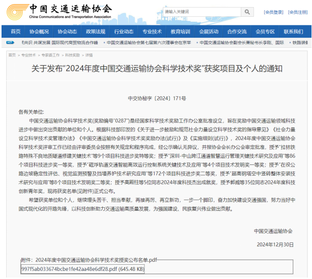 “中國交通運輸協會科學技術獎”是由國家科學技術獎勵工作辦公室批準設立,旨在獎勵中國交通運輸領域中做出突出貢獻的單位和個人,是國家科技獎勵的重要組成部分,被業內譽為“全國交通運輸行業最高科技獎”。