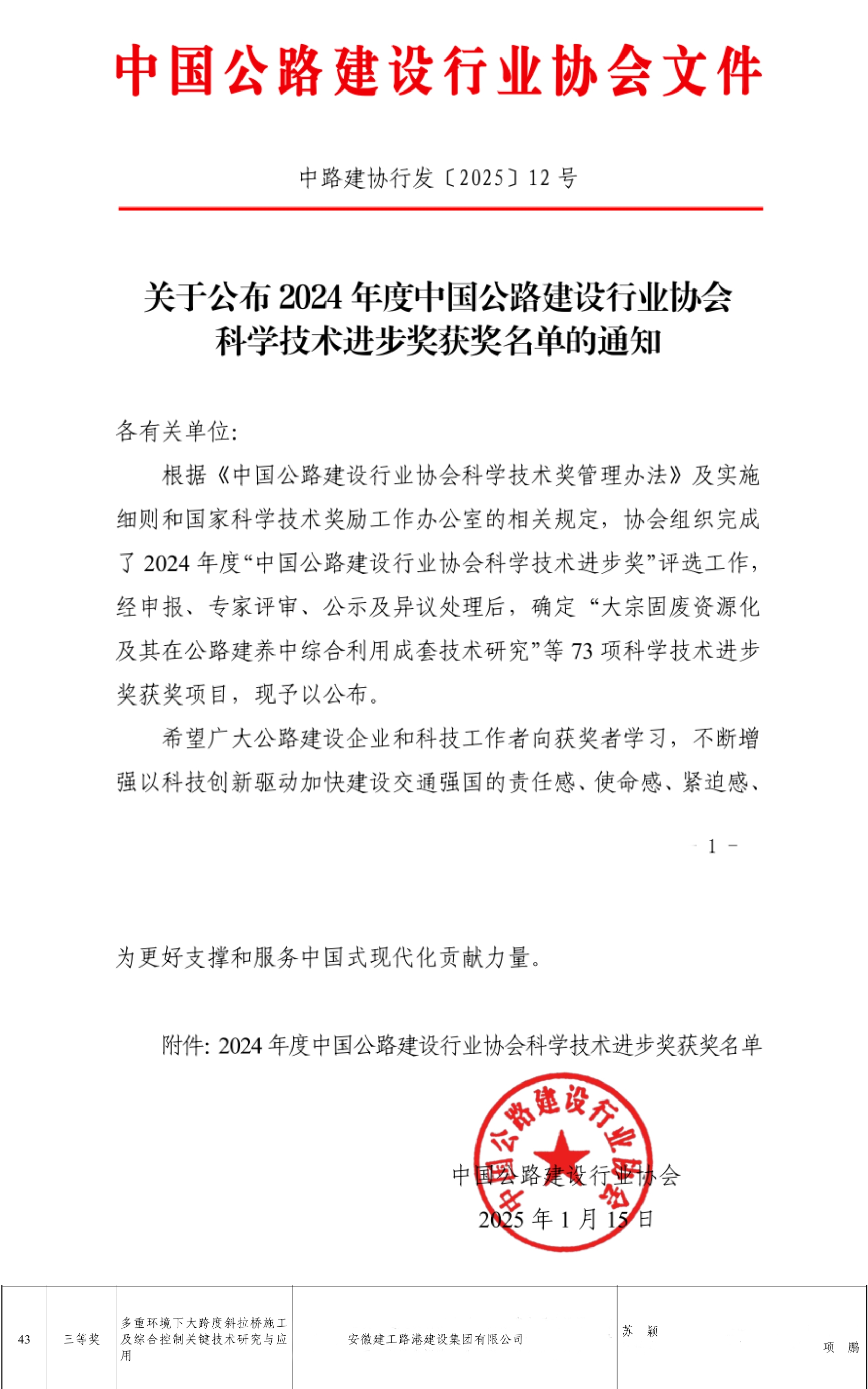 近日,中國公路建設行業協會公布了2024年度科學技術進步獎獲獎名單,建工路港“多重環境下大跨度斜拉橋施工及綜合控制關鍵技術研究與應用”榮獲三等獎。