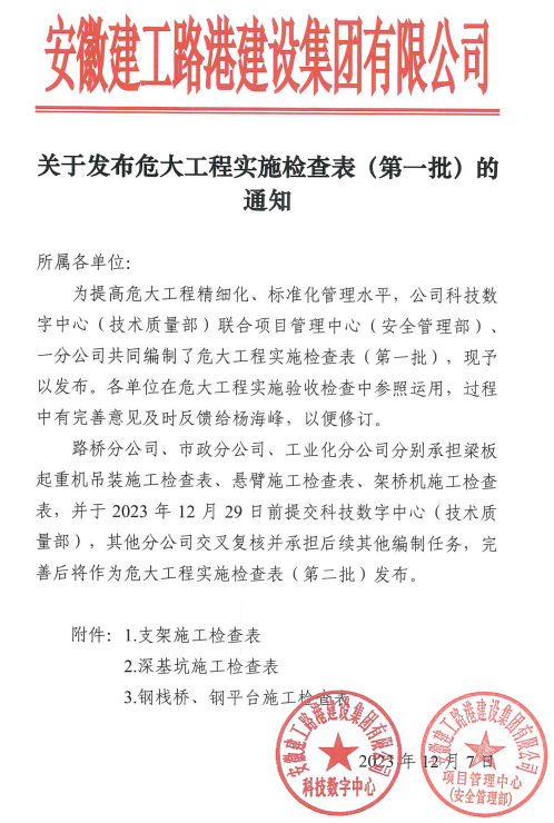 科技數字中心(技術質量部)聯合安全管理部、各分公司共同編制,分批發布了支架施工、深基坑施工、鋼棧橋及鋼平臺施工、梁板吊裝、掛籃懸臂澆筑、架橋機架設方案6項常見的危大工程實施過程檢查表,危大工程實施驗收檢查中參照使用,可以更全面、更好地指導危大工程實施,提高危大工程精細化、標準化管理水平。