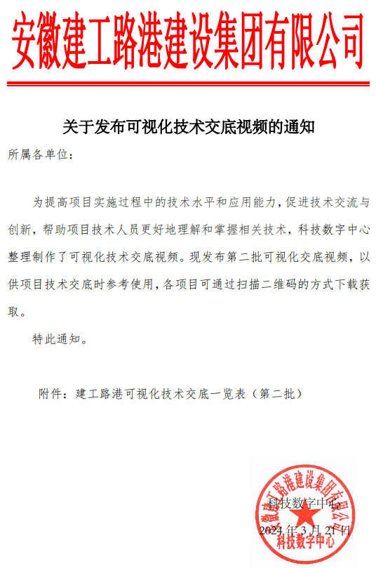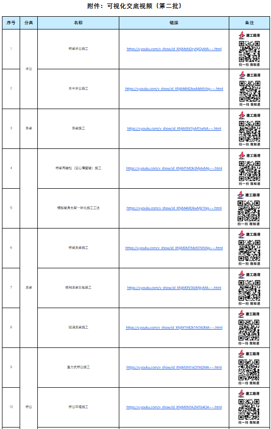 整理制作了47個橋梁基礎、承臺、系梁、蓋梁、橋臺、支座施工和鋼棧橋施工可視化技術交底圖冊及視頻,供項目技術交底時參考使用,各項目可通過掃描二維碼的方式下載獲取,幫助項目技術人員更好地理解和掌握相關技術,提高項目實施過程中的技術水平和應用能力。