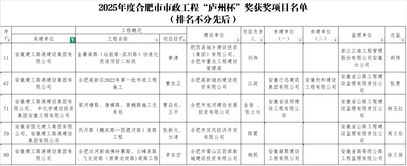 近日,合肥市市政工程協會正式公布《關于2025年度合肥市市政工程“廬州杯”獎獲獎項目名單的通知》,建工路港五個項目榮獲該獎項。