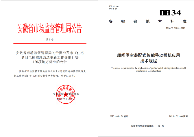 近日,安徽省市場監(jiān)督管理局發(fā)布了2025年度安徽省地方標準公告名單,建工股份、建工路港公司主編的《船閘閘室裝配式智能移動模機應(yīng)用技術(shù)規(guī)程》(DB34T 5183—2025)正式落地實施。該標準是全國首部針對船閘智能建造的技術(shù)規(guī)程,不僅為安徽船閘工程建造技術(shù)革新提供了堅實的規(guī)范指引,更標志著全國水運基礎(chǔ)設(shè)施建設(shè)領(lǐng)域邁入了新的里程。
