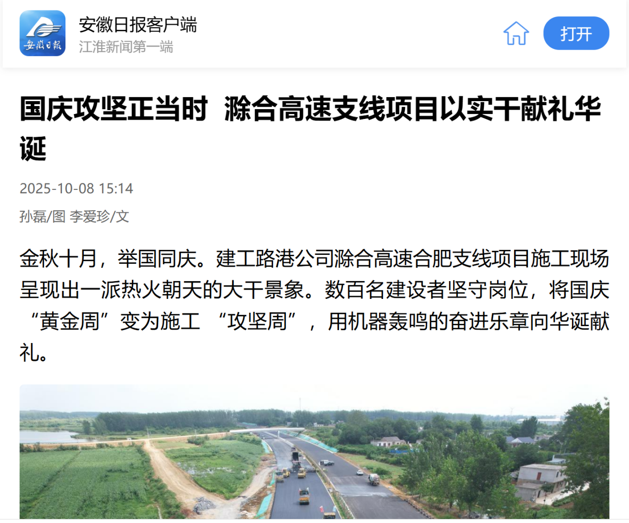 中秋國慶“雙節”期間,安徽日報對建工路港公司承建的G4222和襄高速項目、滁合高速支線項目等重點項目“雙節”攻堅大干進行了報道。