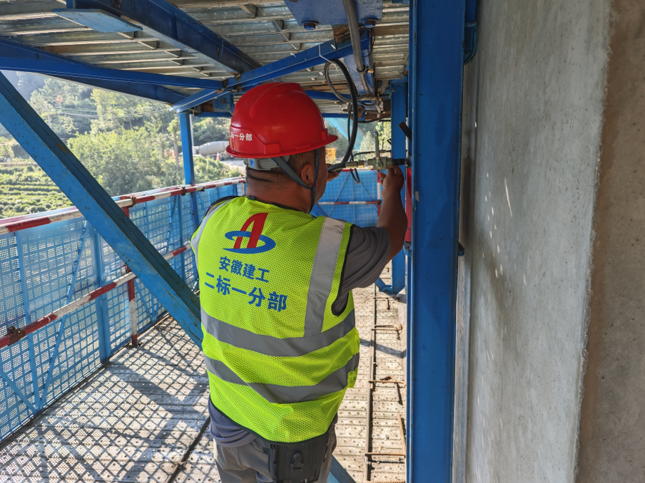 安全是底線,更是紅線。項目推行人工挖孔樁“全流程格式化”管控,鎖口預埋防墜錨固點,孔口設置定型化圍擋,臨山側加裝竹膠板防落石;嚴格執行有限空間作業標準,每2小時檢測有害氣體,爆破作業實行清單化閉環管理。在高墩施工中,創新采用輕量化組合式抱箍連接梯籠,提升登高作業安全性;沖擊鉆泥漿池配備標準化作業平臺,實現風險源頭可控。